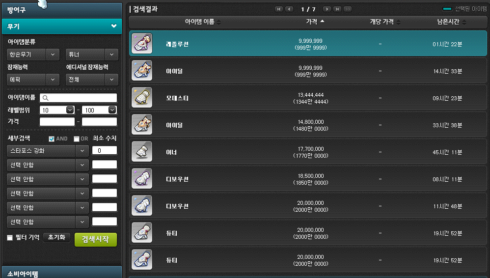 인기직업 아델의 에픽 튜너는 무려 7페이지에 가격도 999만 9999메소입니다.