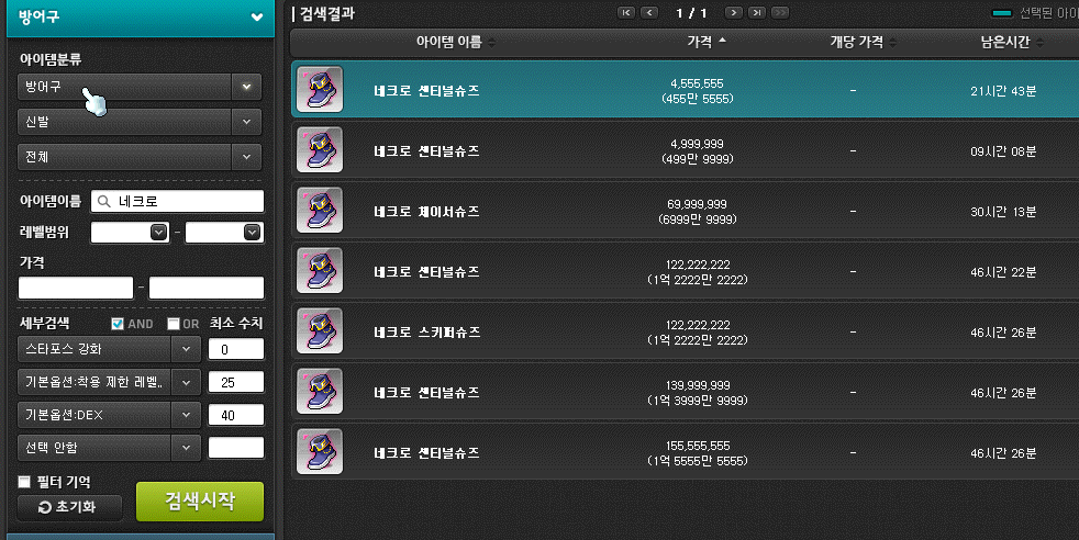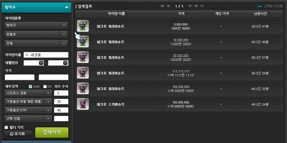 사실 힐라의 방어구는 특정 옵션을 가지고 있을 경우 매우 높은 가격대를 형성합니다.