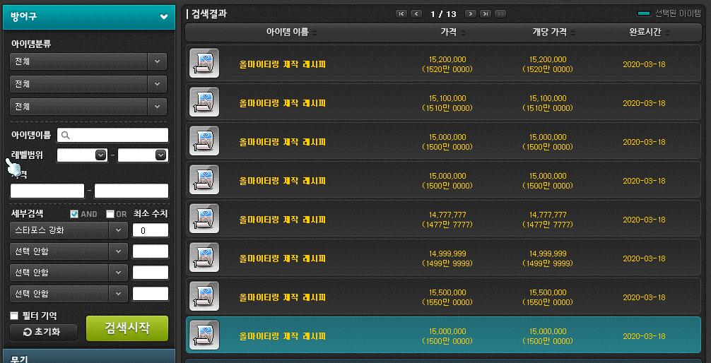 그렇다 보니 올마이티링을 구매하시는 분들도 많아서 레시피 또한 매우 빠른 속도로 거래됩니다.