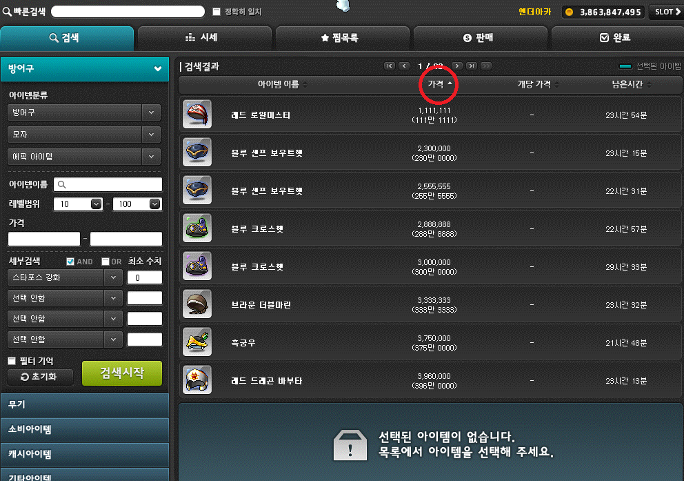 1. 경매장에 접속하여 애픽 방어구를 검색합니다.
