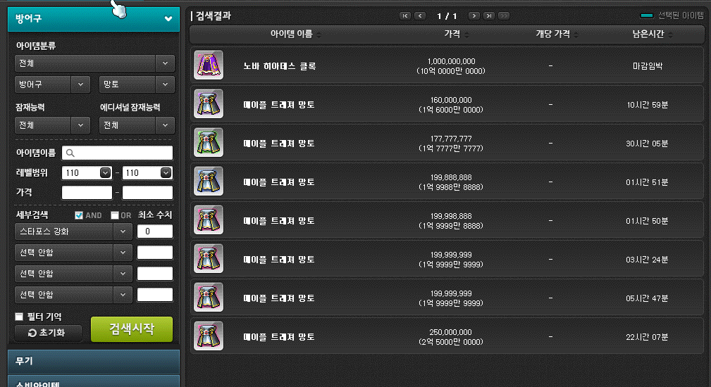 보시다시피 110제 망토의 가격이 1억이 넘어가는 상황입니다.